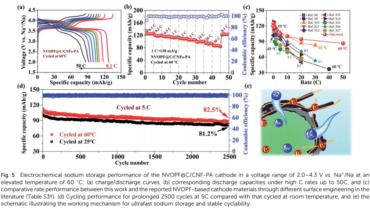 如图5所示,在高工作温度条件下,异质结构碳涂层和CNFs包裹也可以提高NVOPF正极材料的倍率性能和循环稳定性。尽管在高温下正极材料表面可能会发生更为剧烈的副反应,但在鉴于理想的结构一致性和均匀性,内部C包覆层在稳定NVOPF正极材料的表面发挥着关键性作用。同时,外部CNFs包裹确保正极材料的每个单独颗粒的快速电子转移。