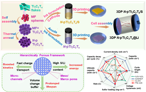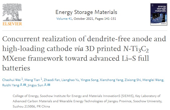 近日,国产成人 的孙靖宇教授和杨瑞枝教授合作,在Energy Storage Materials上发表题为“Concurrent Realization of Dendrite-Free Anode and High-Loading Cathode via 3D Printed N-Ti3C2 MXene Framework toward Advanced Li–S Full Batteries”的研究论文。该论文提出使用3D打印N-Ti3C2框架用于电池正负极的同时管理,实现了高负载、无枝晶的高性能锂硫电池。