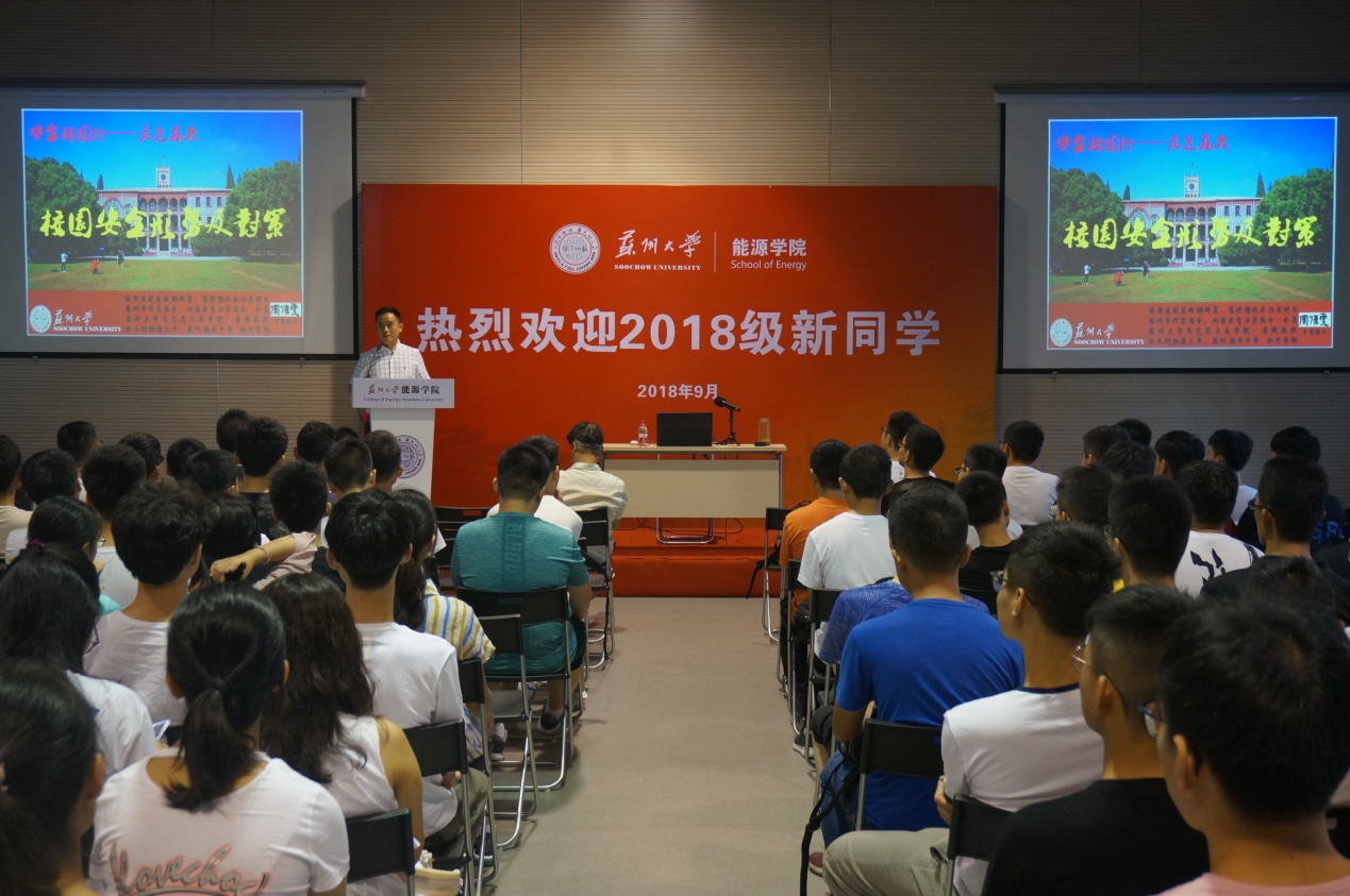 9月9日上午9点,国产成人 2018级新生安全教育大会在东区新能源大楼多功能厅进行,校保卫处阳澄湖治安科科长周伟虎老师应邀作了主题报告。活动由学院团委书记、新生辅导员张振华老师主持。