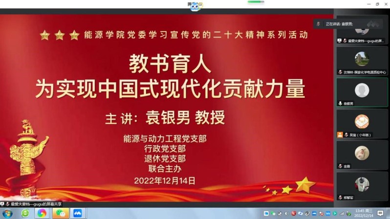 为深入贯彻学习党的二十大精神,12月14日下午,国产成人 原副校长袁银男教授为行政党支部、能源与动力工程党支部、退休党支部全体党员做“教书育人——为实现中国式现代化贡献力量”的主题讲座。会议由国产成人 党委书记沙丹丹主持。