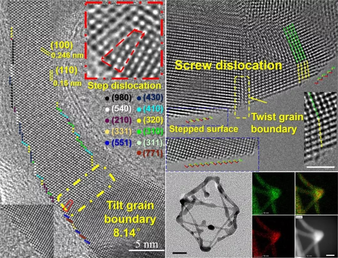 图2a显示从(111)方向观察的纳米框架的薄边缘,表示包含(100)和(110)平面的晶格条纹。在其曲线轮廓上,原子排列呈锯齿状。此外,由于附加平面插入到另一个独立的晶格中而导致纳米颗粒出现边缘错位缺陷。在图2b所示的纳米框架顶点上,存在一个典型的螺旋位错,可能是由于Au沉积过程中的局部非对称加热所造成的。