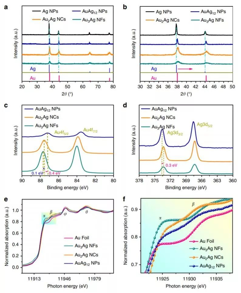 为了研究金和银原子的表面电子态和局域配位,对样品进行了XPS和XAFS分析。由图可知,当Au-Ag纳米结构从纳米颗粒转变为纳米框架时,Au的XPS分峰向更高的结合能方向偏移。另一方面,Ag的XPS分峰向较低的结合能方向偏移。