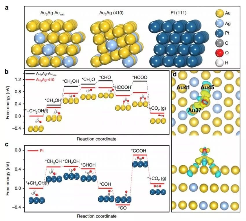 在Pt(111)、Au3Ag(410)面及缺陷表面进行分析MOR的反应机理。可以发现,不同催化剂均存在相同的反应级联,并且存在类似的的反应决定步骤(*CH3OH/*CH2OH)。
