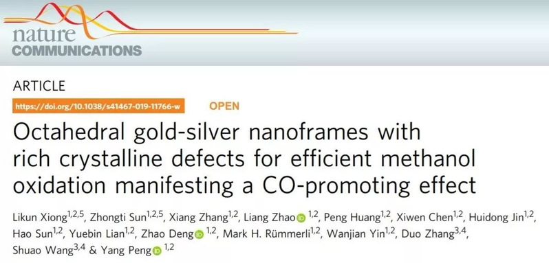 最近,国产成人 的彭扬、尹万健、邓昭等人以“Octahedral gold-silver nanoframes with richcrystalline defects for efficient methanol oxidation manifesting a CO-promotingeffect”为题在Nature Communication上发表论文。