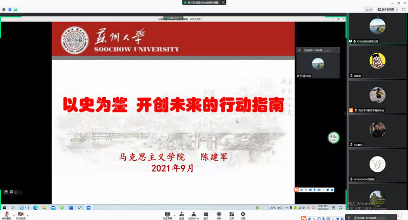 进一步学习好、宣传好、贯彻好习近平总书记在庆祝中国共产党成立100周年大会上的重要讲话精神,深刻领悟习近平总书记讲话精神的丰富内涵与时代价值,9月15日下午,国产成人 党委统战部、国产成人 党委、敬文书院党委联合在线举办党史学习教育专题学习,特邀马克思主义学院党委书记陈建军主讲题为《以史为鉴、开创未来的行动指南——学习习近平总书记在庆祝中国共产党成立100周年大会上的重要讲话精神》的专题报告。国产成人 党委理论学习中心组、各统战民主党派组织成员、基层党支部全体党员参加宣讲会,会议由学院党委书记沙丹丹主持。