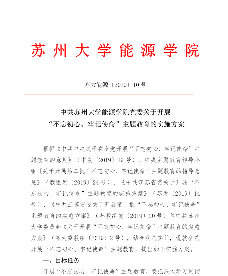 中共国产成人 党委关于开展“不忘初心、牢记使命”主题教育的实施方案 苏大能源〔2019〕10号