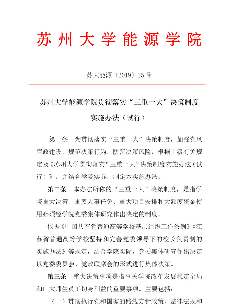 国产成人 贯彻落实“三重一大”决策制度实施办法(试行) 苏大能源〔2019〕15号