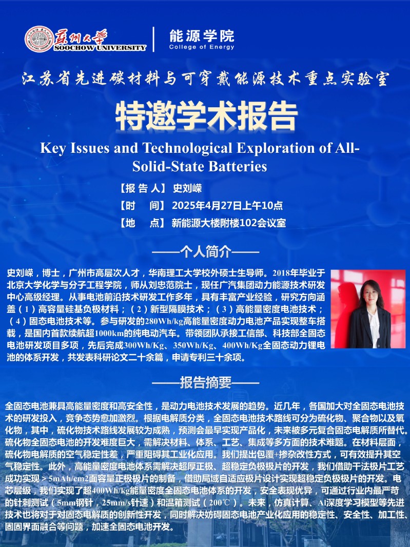 江苏省先进碳材料与可穿戴能源技术重点实验室特邀学术报告
