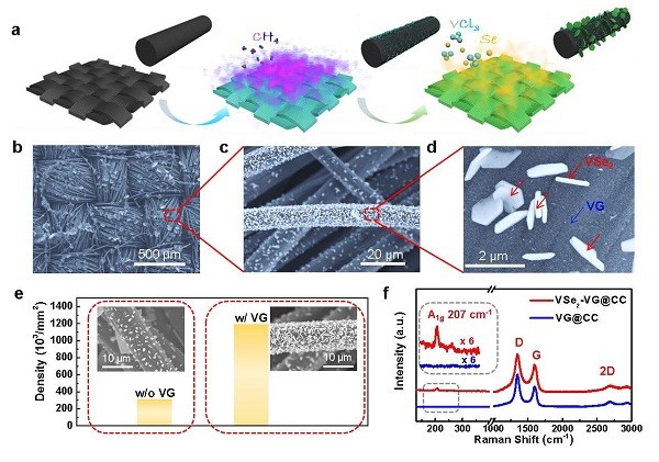 图一:在碳布上使用all-CVD法制备VSe2-VG异质结材料