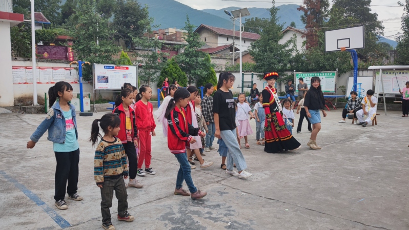 据了解,这8名大学生志愿者是国产成人 “朵儿计划”党员服务团成员,7月中旬开始,在沙丹丹书记的带领下来到四川凉山彝族自治州越西县瑞青小学。为了能感染更多的孩子热情参与,他们做足了预备课。“朵儿计划”创始人任爽来到凉山前,就自学了彝族特色舞蹈《阿诗且》。当朵儿姐姐配上鲜亮的民族服饰欢快的跳起来时,迅速带动了校园里的孩子们欢呼雀跃地加入进来……