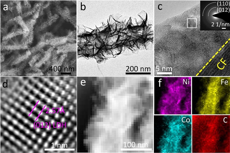 图2. NiFeCo-LDH/CF材料的(a)SEM图、(b-d)TEM和HRTEM图以及(d,f)HAADF-STEM图和对应的元素mapping图。