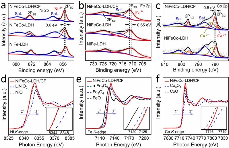 图4. NiFeCo-LDH/CF材料与对比样的(a-c)HR-XPS图和(d-f)Ni、Fe、Co的K边XANES光谱。
