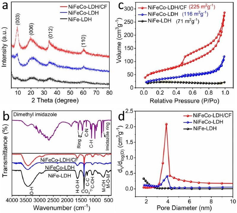 图3. NiFeCo-LDH/CF材料与对比样品的(a)XRD谱图、(b)FT-IR图和(c, d)N2吸附/脱附等温线及对应的孔径分布图。