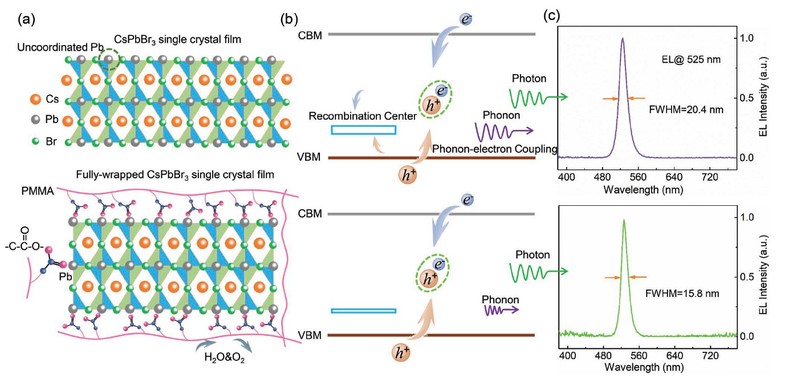 整个自支撑的CsPbBr3单晶钙钛矿薄膜用PMMA包裹以获得完全包裹的结构。通过精确控制PMMA的厚度,用超薄PMMA包裹CsPbBr3单晶薄膜的表面。超薄PMMA作为钝化层来钝化表面和侧面的表面缺陷。基于CsPbBr3单晶薄膜的LED可以实现高色纯度(FWHM=15.8nm),这是目前绿色PeLED的钙钛矿领域最高色纯度。此外,我们基于钙钛矿单晶薄膜的器件可以实现较大的发光面积(>2 mm2),从而有利于实现独立单晶膜的毫米级良好接触。这项工作展示了一种通过垂直器件结构钝化自支撑钙钛矿单晶薄膜的新途径。