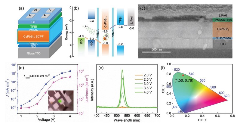 图1.单晶钙钛矿CsPbBr3薄膜的器件结构和器件性能。