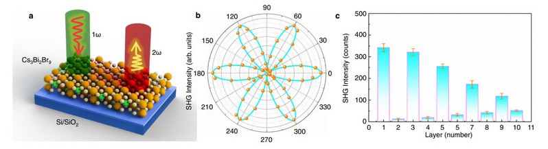 图2原子级厚度Cs3Bi2Br9薄膜随层数变化的SHG性质