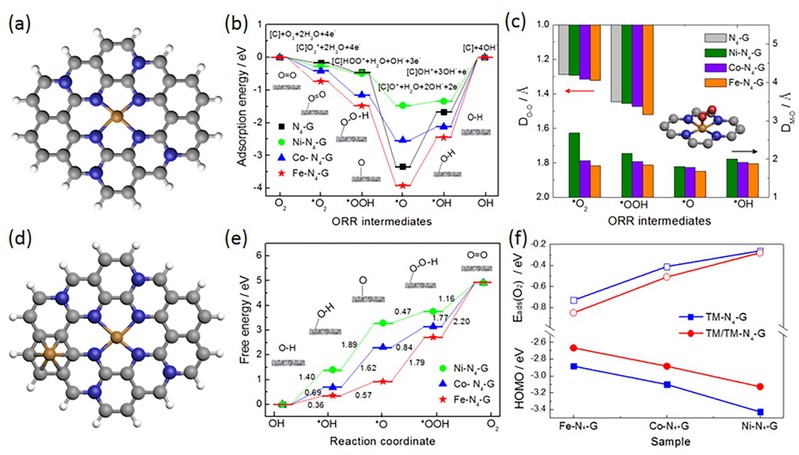 为了进一步理解碳纳米片中嵌入的TM-N4对ORR和OER催化活性的影响,我们进行了DFT计算(图4)。计算结果表明,ORR中间体的吸附强度与金属和最近的氧原子之间的键长直接相关,ORR物种在催化剂上的活性遵循Fe-N4-G>Co-N4-G>Ni-N4-G的顺序;OER物种在催化剂上的活性遵循Fe-N4-G<Co-N4-G<Ni-N4-G的顺序。