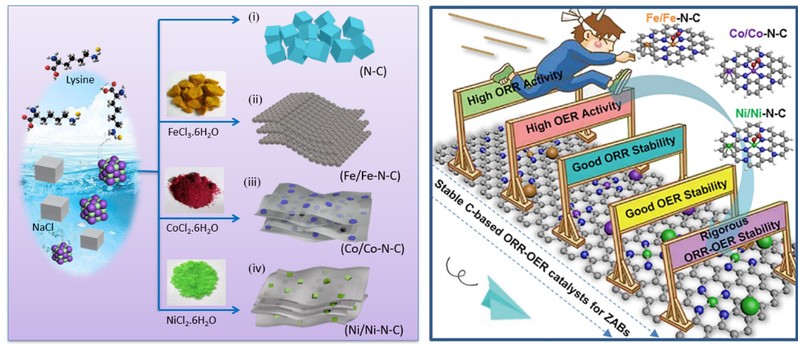 碳材料因为其低廉的价格、良好的导电性、丰富的微观结构以及可被调控的物理化学性质被认为是用于氧还原/放出反应(ORR / OER)的有前途的电催化剂。但是,大多数碳材料在高度氧化的OER环境中不稳定。本文中,通过使用NaCl模板和熔融盐促进的石墨化过程从生物质赖氨酸中开发了氮(N)和过渡金属(TM)共掺杂碳纳米片杂化物(TM/TM-N-C,TM = Fe,Co,Ni)(如图1所示)。在合成的TM/TM-NC中,嵌有Ni纳米立方体的Ni/Ni-N-C在0.06-1.96 V电势范围内表现出优异的ORR-OER稳定性。