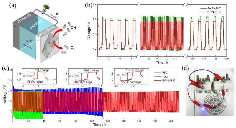 我们将Fe/Fe-N-C和Ni/Ni-N-C应用于可充电ZAB(图2),探究它们作为正极催化剂的电池充-放电循环性能,并与商用Pt/C和IrO2进行对比。在长期充-放电循环中,基于Ni/Ni-N-C催化剂的ZAB放电电压明显高于商用Pt/C,而充电电压则低于商用IrO2,能够稳定循环充-放电长达210小时,具有优异的循环稳定性。