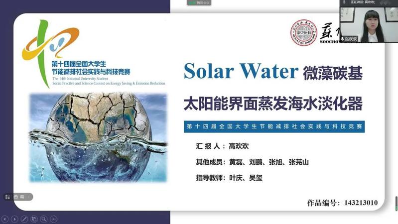 随着专业知识的进一步深入和科研经验的不断累积,高欢欢选择加入科研课题“Solar Water微藻碳基太阳能界面蒸发海水淡化器设计” ,她在项目中负责实验材料制备,进行相关实验优化,参与撰写产品设计说明书,在第十四届全国大学生节能减排社会实践与科技竞赛决赛中,她作为项目汇报人参加答辩,最终项目荣获一等奖。