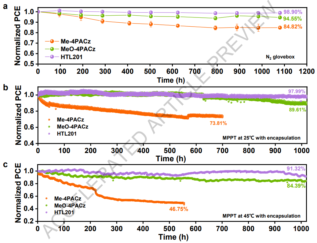 1.本文首先研究了未封装器件的储存稳定性。基于HTL201的串联太阳能电池展现出卓越的储存稳定性,在1080小时储存后仍保持约98.9%的初始效率。相比之下,含MeO-4PACz和Me-4PACz的器件仅分别保留了94.6%和84.8%的初始光电转换效率(图4a)。同时,在25℃和45℃环境温度下,对基于Me-4PACz、MeO-4PACz和HTL201的封装器件进行了持续光照下的最大功率点追踪测试(图4b和c)。经过1020小时运行后,HTL201基器件在25℃下保持约98.0%的初始效率,在45℃高温下保持91.3%的初始效率。而MeO-4PACz基器件在25℃和45℃下分别保持89.6%和84.4%的初始效率,Me-4PACz基器件则在500小时后出现显著衰减。