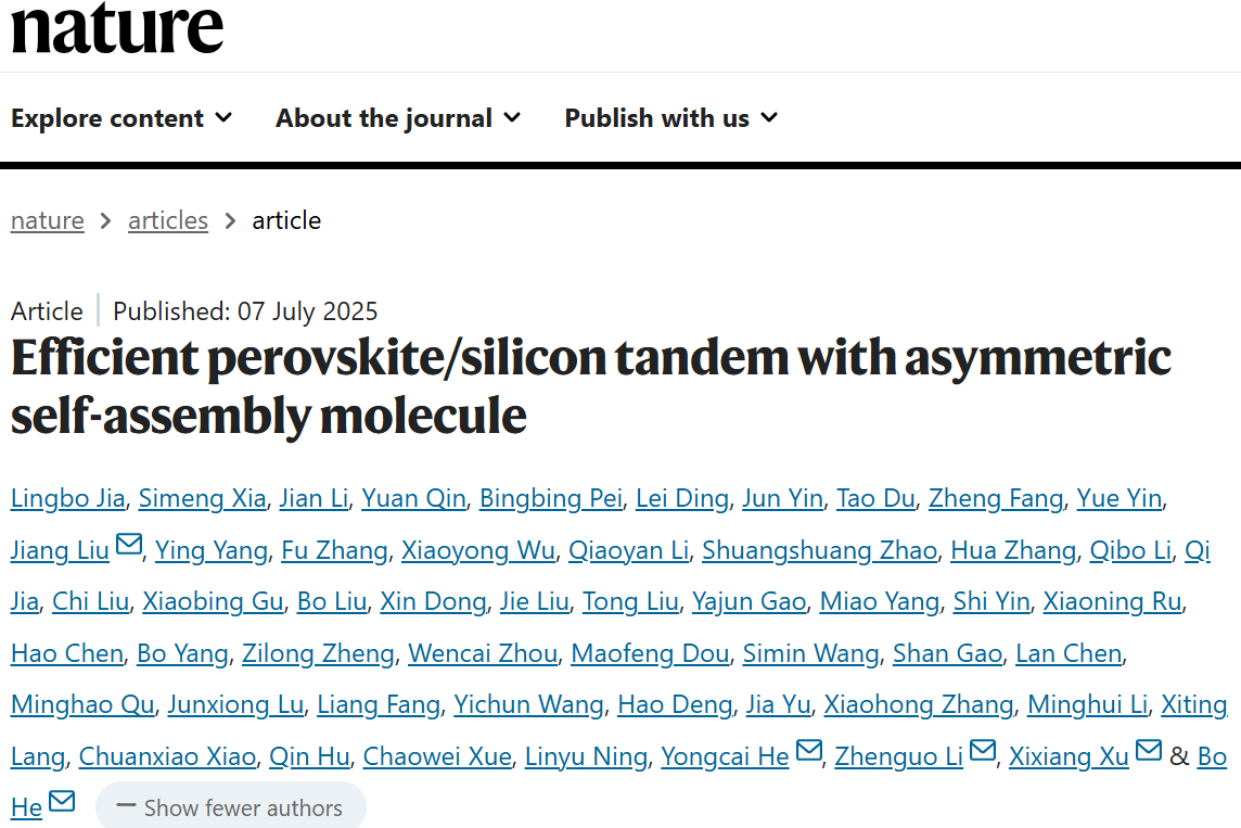 本研究设计了一种不对称SAM分子(命名为HTL201),其以咔唑为核心,两侧分别连接锚定基团和间隔基团,作为钙钛矿/硅TSCs的空穴选择层(HSL)。与含氮键合膦酸基团的对称SAMs相比,HTL201分子在透明导电氧化物(TCO)复合层上展现出最小的空间位阻和更优的覆盖度。HTL201与钙钛矿薄膜间的强配位作用有效降低了埋底界面的非辐射复合。值得注意的是,钙钛矿与HTL201之间优化的能级排列,配合钙钛矿层准费米能级分裂(QFLS)值的提升,使钙钛矿/硅TSCs获得了近2V的惊人开路电压,基于硅异质结(SHJ)太阳能电池实现了认证功率转换效率(PCE)高达34.58%的突破性成果。