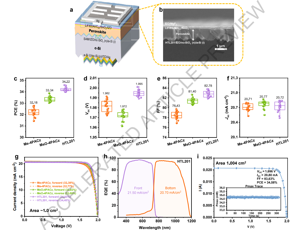 1.本文采用硅异质结太阳能电池作为底电池,构建了钙钛矿/硅叠层太阳能电池。顶部钙钛矿电池基于不同自组装单分子层(SAMs)制备,其结构为IZO/SAM/钙钛矿/LiF/二碘乙二铵(EDAI)/C60/SnO2/IZO/Ag/MgF2。图2a和2b分别展示了基于HTL201的器件结构及截面扫描电子显微镜(SEM)图像。通过20个独立器件的箱线图(图2c-2f)及相应光伏参数对比可见:采用HTL201的器件平均光电转换效率(PCE)达34.22%,其中最优叠层电池效率高达34.60%,开路电压(VOC)突破2.001 V,短路电流密度(JSC)为20.64 mA/cm2,填充因子(FF)达83.79%。相比之下,Me-4PACz和MeO-4PACz的平均PCE分别为32.18%和33.34%。HTL201器件在VOC和FF上均显著优于另两种SAM材料。