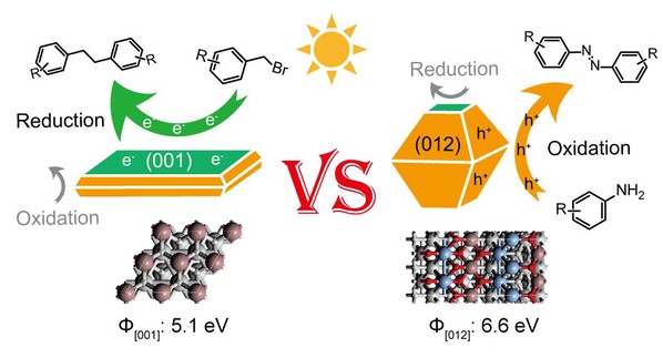 近日,ACS Catalysis在线发表了国产成人 苏韧教授课题组与尹万健教授课题组在铜铁矿型(ABO2)催化剂在光催化有机合成领域的最新成果。该工作研究了形貌可控的AgGaO2催化剂在光催化自偶联反应体系中,不同的(012)和(001)晶面暴露比对光催化剂氧化还原能力的影响。光催化性能测试结合理论计算表明,在AgGaO2光催化剂中,(001)晶面作为电子富集面更有利于进行还原偶联反应,而(012)晶面作为空穴富集面,则更有利于氧化偶联反应。