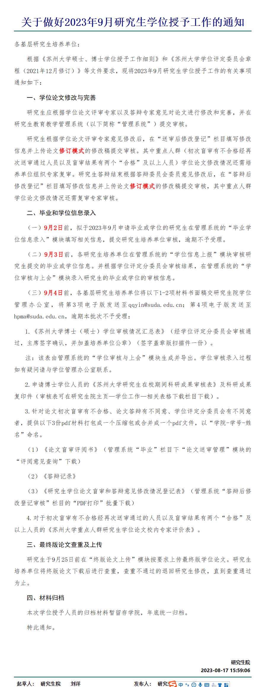 一、根据学校通知《关于做好2023年9月研究生学位授予工作的通知》//file.gc-cr.net/defaultroot/gov/info_view_my.jsp?whir_new_verifyCode=1&editId=36128285,请以下同学根据通知做好通知中要求的工作。