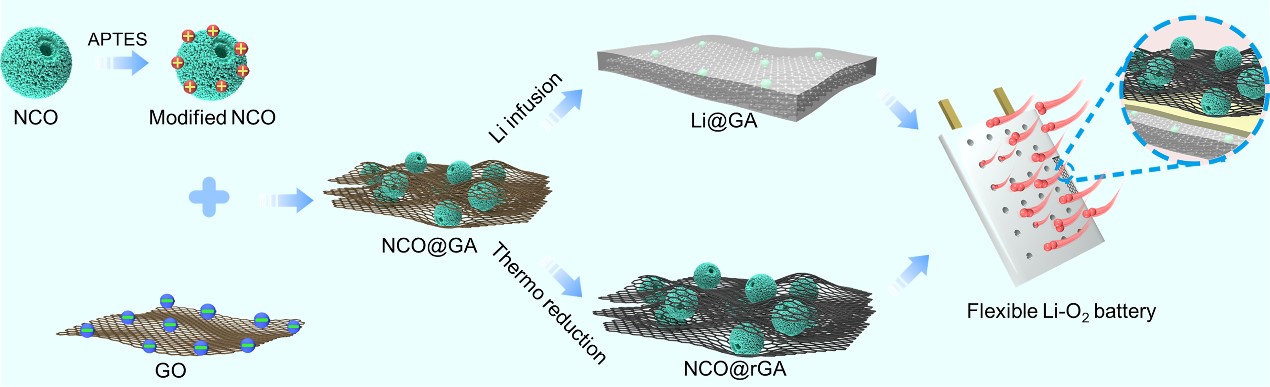 Schematic diagram to depict the fabrication of the NCO@GA backbone and the assembly of Li-O2 batteries using the Li@GA anode and NCO@rGA cathode derived from NCO@GA.