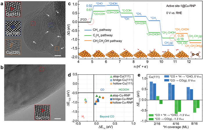 球差TEM结合DFT计算表明,KB的添加导致还原得到的Cu具有高度复杂的晶格结构,包含多种晶面、晶界和晶格缺陷。这种晶面结构有着明显的几何效应同时有利于增强*CO中间体的吸附,此外还抑制了HER竞争反应,从而促进了C-C偶联,提高了乙烯选择性。 而未添加KB的MOF还原得到的Cu颗粒,由于奥氏熟化,显示相对单一的晶格结构特征,更有趋向于得到甲烷和氢气。