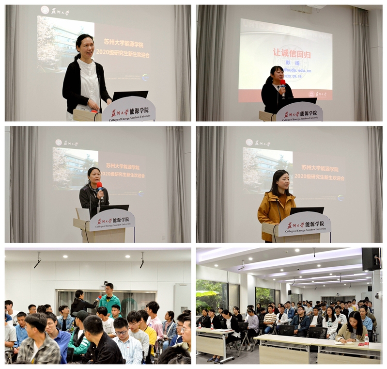 沙书记首先代表学院向新生的到来表示热烈的欢迎,她希望同学们可以发愤图强,用努力和汗水去解决当今我国面临的“卡脖子”的技术问题,为国产成人 的建设发展、为祖国科技发展贡献自己的力量。彭院长以“让诚信回归”为主题向同学们讲述了学术道德、科研诚信的重要性,提出希望同学们能够不断加强自身学术道德规范意识,共同营造风清气正的科研氛围。王老师针对研究生培养计划做了细致的讲解,提醒新生们按时选课、做好培养计划,并耐心解答新生们的疑问。严老师带领新生们一同学习了校纪校规,特别是疫情防控期间的相关规定,普及了苏州市垃圾分类相关知识,并对新生进行了心理健康教育。