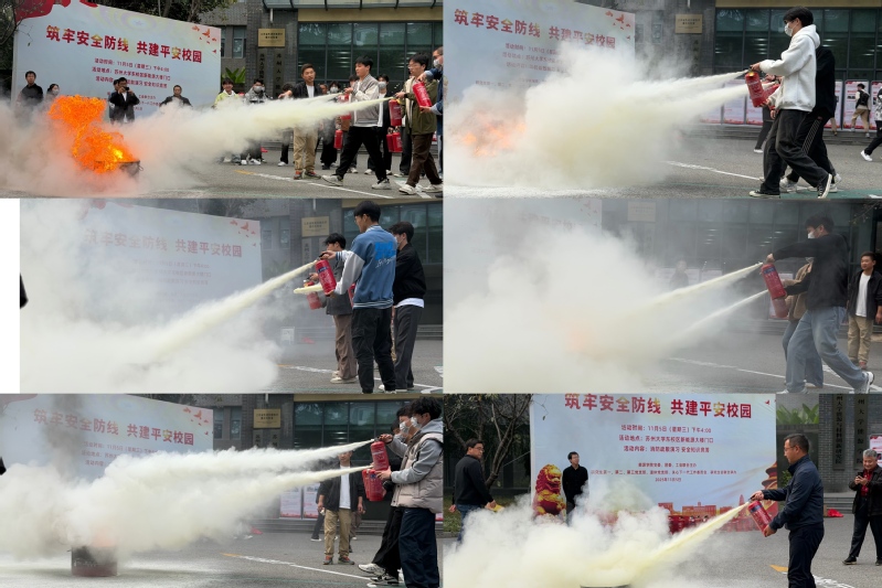 随后是灭火器使用的专项培训。来自校保卫处的专业人员为师生们详尽的讲解了灭火器的相关知识,内容涵盖了灭火器在不同火灾场景下的具体操作步骤和注意事项。讲解过程中,专业人员不仅通过理论知识的传授,还结合实际案例,生动地展示了灭火器使用的要点和技巧。随后,为了让师生们更好地掌握这些知识,活动还特别安排了实践环节,邀请师生代表亲自上阵,进行灭火器的实际操作示范。在专业人员的指导下,师生代表们逐一体验了灭火器的使用过程,确保每个人都能熟练掌握这一重要的安全技能。
