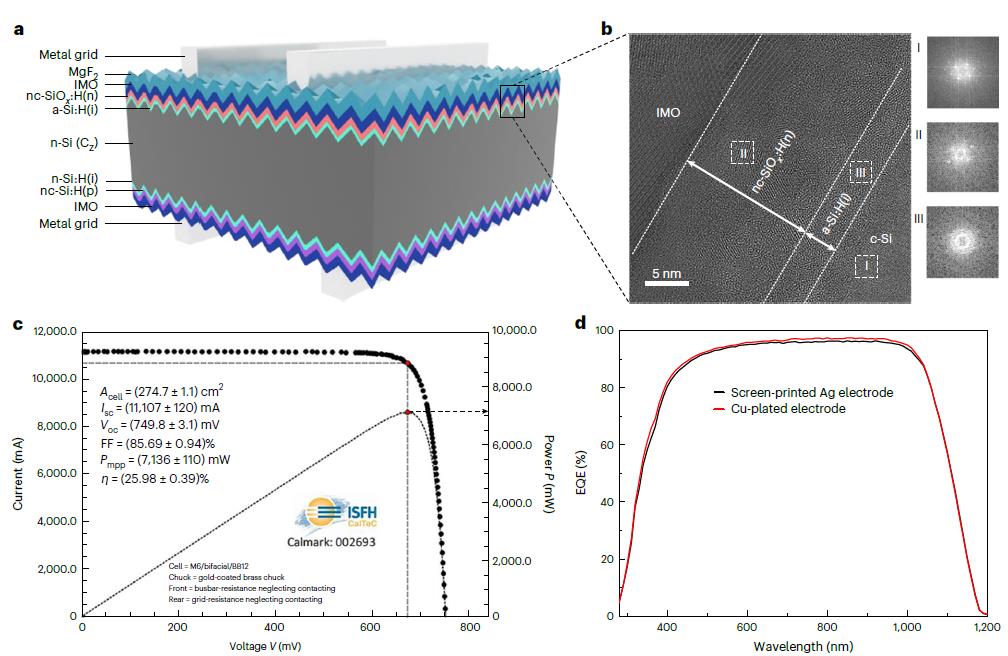 为充分挖掘硅异质结(SHJ)太阳电池的性能潜力,需要进一步减少寄生吸收和栅线遮挡。然而,纳米氧化硅(nc-SiOx:H)窗口层和镀铜电极的低成本和规模化制备仍然是主流SHJ技术的最大障碍之一。基于此,苏州迈为研发团队通过开发具有最小化驻波效应的工业规模甚高频等离子体增强化学气相沉积系统来解决第一个挑战。同时,结合无种子层铜电镀技术制备的高质量铜电极,在M6尺寸双面SHJ电池上实现26.41%高光电转换效率。国产成人 杨新波教授团队对nc-SiOx:H(n)层的微观结构、界面演变、大面积均匀性、暗衰机理、电池效率损失分析等方面做了大量深入的研究。这项工作为高效率异质结电池的大规模产业化铺平了道路。