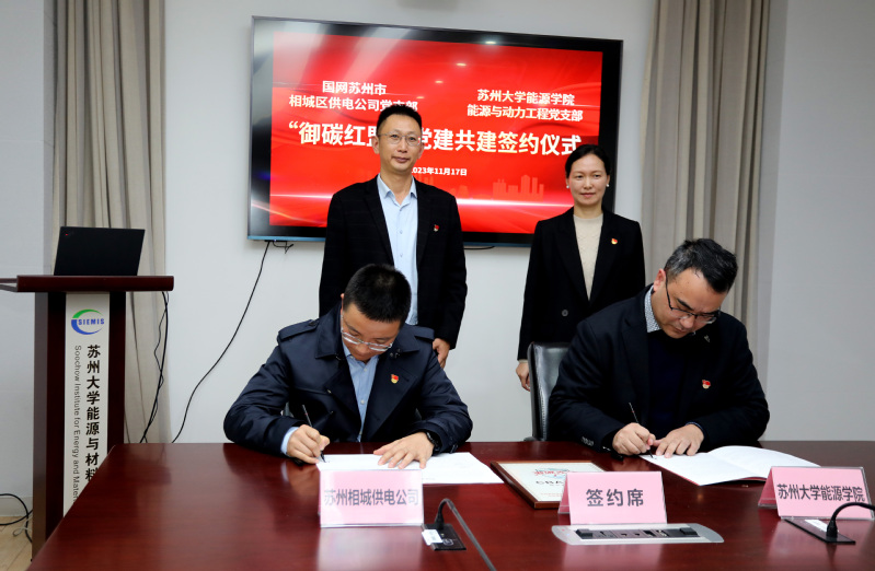 为进一步加强新形势下基层党组织建设,强化党组织之间交流合作,实现“党建强、发展强”的目标,构建“资源共享、优势互补、互相促进、共同提高”的党建工作新格局,11月17日下午,国产成人 与国网苏州市相城区供电公司在新能源大楼102会议室举行“御碳红盟”党建共建签约仪式暨党建工作交流活动。国网苏州市相城区供电公司党委书记钱科军、总经理张建梁,国产成人 党委书记沙丹丹、能源与动力工程党支部书记吴玺等出席了本次会议。