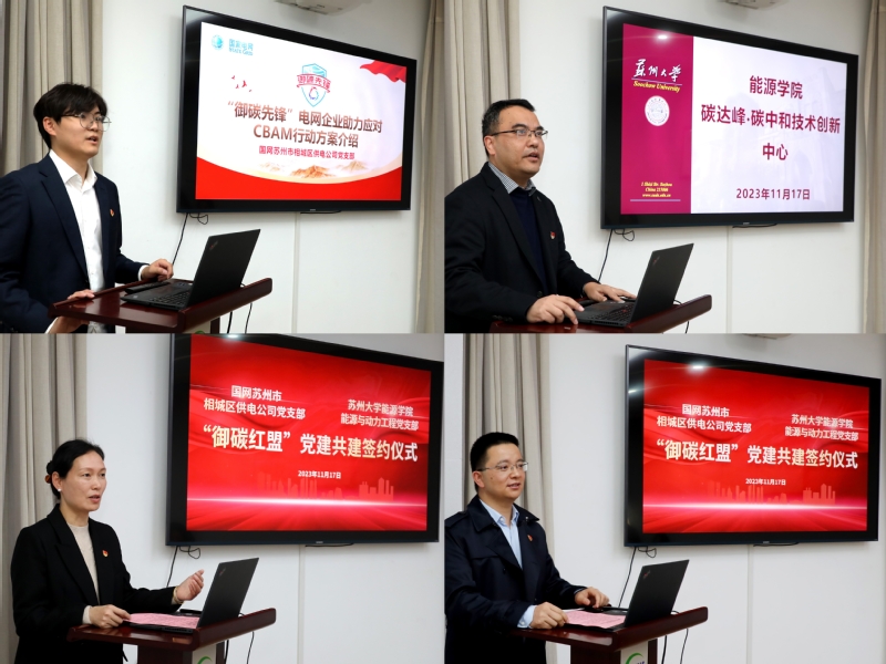 会议伊始,国产成人 与国网苏州市相城区供电公司互相介绍了参加本次活动的各位领导及老师。紧接着,国网苏州市相城区供电公司的顾禛奕同志介绍了“御碳先锋”电网企业应对CBAM(欧洲碳边境调节机制)的行动方案,阐述了国网苏州市相城区供电公司党支部如何运用“御碳优能”进一步扩展公司的能效服务、如何为越来越严峻的国外碳关税政策做好准备;国产成人 能源与动力工程专业系主任吴玺介绍了国产成人 目前所有的师资力量、科研方向以及“碳达峰·碳中和技术创新中心”为应对接下来CBAM的碳关税政策目前进行的研究和未来的发展规划,同时表达了对两方基层党支部结对共建的未来展望。