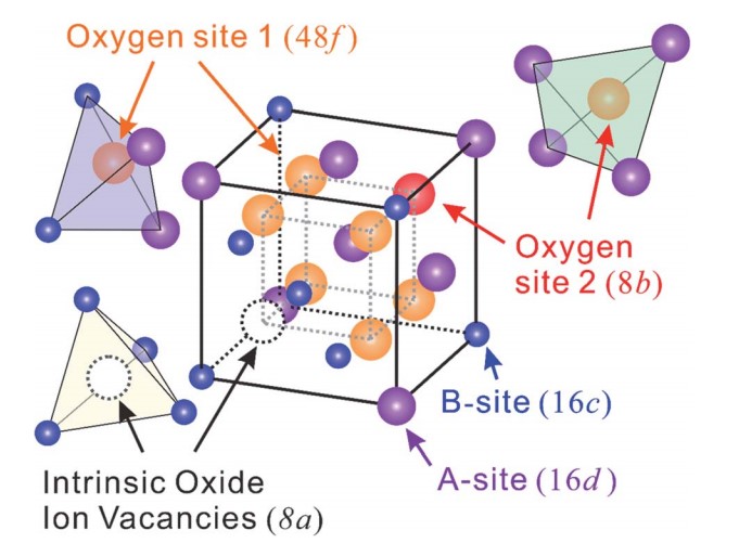 质子导电陶瓷燃料电池(PCFC)是一种工作于中温区(450~700°C)的极具应用前景的下一代燃料电池。PCFC中最关键的部分是电解质,其直接决定了燃料电池的工作温度,并主导了电极和结构材料等其它部分的选择和研发策略。PCFC的电解质要求具备良好的化学稳定性和高质子电导率,采用低价阳离子掺杂以提高氧空位浓度,进而促进水合反应引入质子是提高PCFC电解质的质子电导率的常用方法。然而,如图1以烧绿石结构为例,氧化物型电解质中普遍存在多个阳离子位置,如何准确地确定适合的掺杂位置,是科研人员们普遍关注的一个问题。