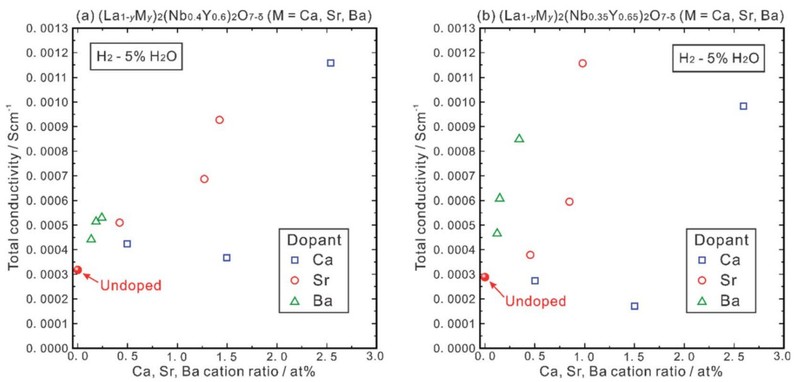 近日,国产成人 韩东麟教授团队使用低温EXAFS分析了质子导电型烧绿石氧化物La2(Nb0.4Y0.6)2O7-δ(LNY60)和La2(Nb0.35Y0.65)2O7-δ(LNY65)中的有效掺杂位置。如图2所示,LNY60和LNY65的水合前后的EXAFS对比分析显示,水合后La和Y附近的阳离子配位数增加,且局部晶格结构发生了膨胀,表明La和Y位是掺杂的有效位置。因此,采用二价的Ca、Sr和Ba阳离子对三价的La进行了掺杂,如图3所示,质子电导率随着Ca、Sr和Ba掺杂浓度增加而升高。特别是,2.54 at%的Ca掺杂的LNY60,以及0.98 at%的Sr掺杂的LNY65在700°C时的电导率均达到1.16×10-3 Scm-1,比未掺杂样品的总电导率高出近四倍。上述结果表明,借助EXAFS分析可准确地确定合适的掺杂位置,进而指导精准掺杂来提高固体氧化物中的质子电导率。