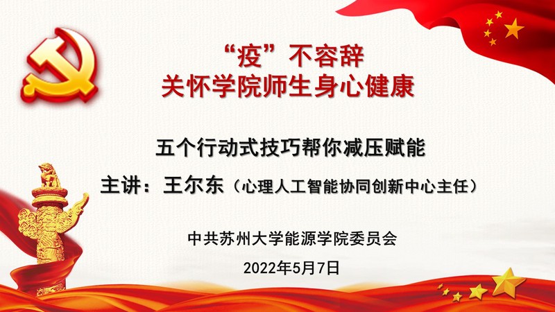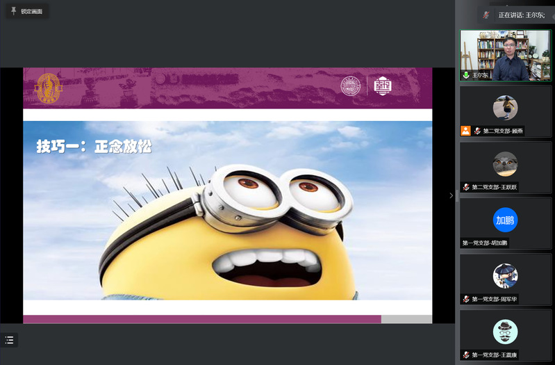 为帮助学院师生缓解心理压力,调整积极状态, 2022年5月7日,国产成人 教职工党支部、研究生党支部和本科生党支部在线联合举办“‘疫’不容辞 关怀学院师生身心健康”开放式主题党日活动,特邀国产成人 心理人工智能协同创新中心主任王尔东主讲题为《五个行动式技巧帮你减压赋能》的专题讲座。会议由学院党委书记沙丹丹主持。