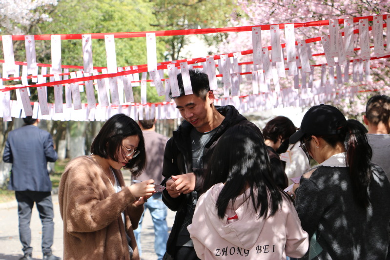 活动伊始,学院师生纷纷来到樱花树下摘取感兴趣的题卡,抬眼望花,低眸看题,一派和谐。随着活动的开展,答题的师生们情绪逐渐高涨,热情洋溢,在互问互助互学中沟通交流着,欢声与笑语萦绕花枝,荡漾在整个樱花大道。求知的热情与青春的活力相互交织,处处彰显着能源青年的锐气和风采。