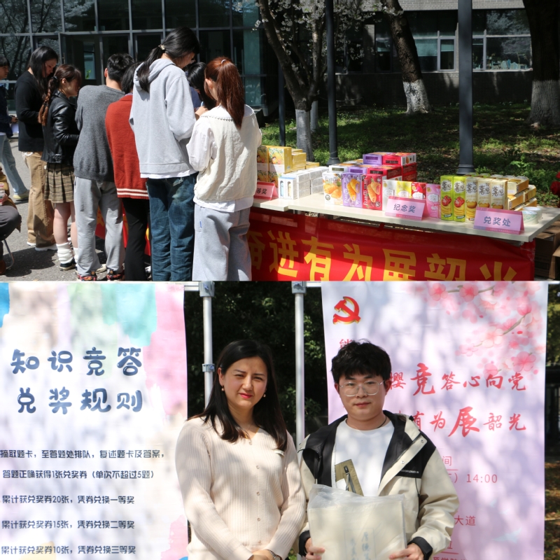 粉白樱花争相盛放,竞答现场热闹非凡。答题处,志愿者们认真倾听并核对答题者的答案,按序发放兑奖券;兑奖处,各类奖品琳琅满目,整齐摆放在桌台上,包括学院定制的帆布包、伸缩书立、多功能小闹钟、手持风扇、蒸汽眼罩、饼干薯片等等。答题者们手持数量不一的兑奖券前往兑奖处,依序兑换。