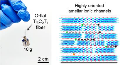 邵元龙课题组采用湿法纺丝中微流体控制及牵伸速率诱导Ti3C2Tx片层定向堆积,组装高度取向二维通道结构,并通过Mg2+离子交联,制备具有优异机械性能、离子传导和电子传导的取向Ti3C2Tx纤维,同时展现出更高的体积存储容量。为未来高性能、低成本纤维型可穿戴电子器件的发展带来了广阔前景。