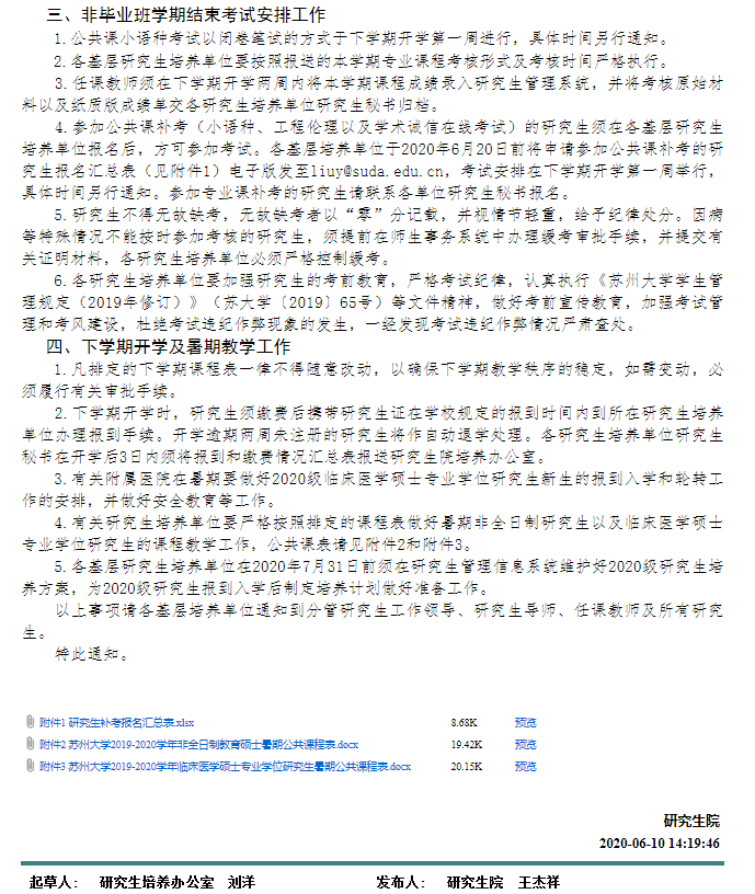 关于“非毕业班学期结束考试工作”中,其中有一项请2019级同学们注意:参加公共课补考(小语种、工程伦理以及学术诚信在线考试)的研究生须在各基层研究生培养单位报名后,方可参加考试。请同学们登陆研究生信息管理系统查看自己的成绩,如要参加公共课补考,务必在6月17日(周三)之前到学院教学办公室王老师处报名,逾期不予处理。