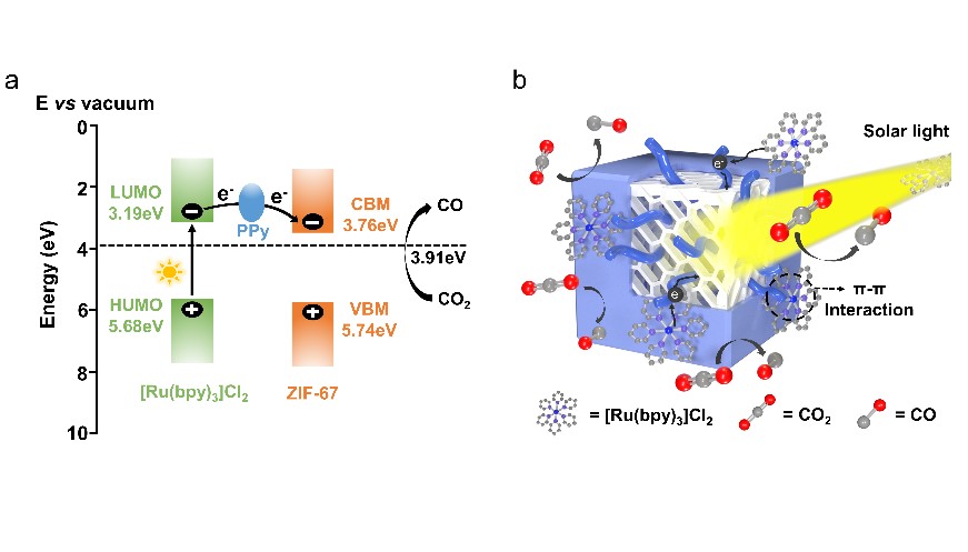该工作报道了新型原位单体捕获策略,用于合成聚吡咯增强的ZIF-67(ZIF-67@PPy),合成过程中发现吡咯单体能够诱导配位调制ZIF-67的晶面,同时该复合材料表现出优异的电导率和较好的水稳定性,作为光催化还原二氧化碳的助催化剂时,显著提高了催化反应活性和稳定性。作者在文中进一步探讨了光催化还原二氧化碳机理。