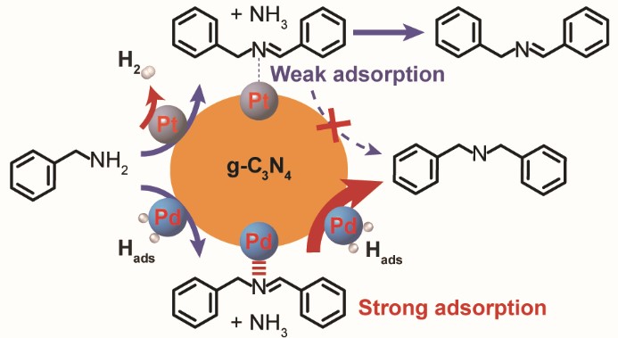 金属纳米颗粒作为助催化剂的一种,广泛地应用于光催化反应中,能有效地控制电荷的分离和存储。但是,金属纳米颗粒在调节光催化反应的选择性方面的催化作用却鲜有报道。近日,国产成人 苏韧教授与天津大学刘翠波副教授在ACS Catalysis上发表了题为”Catalytic Role of Metal Nanoparticles in Selectivity Control over Photodehydrogenative Coupling of Primary Amines to Imines and Secondary Amines”的研究工作。本论文作者以光催化苄胺脱氢偶联为模型反应,以Pt、Pd修饰的g-C3N4为光催化剂,研究了贵金属纳米粒子Pt、Pd在调节该模型反应的选择性方面的催化作用。