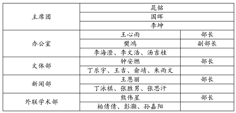接着,执行主席国晖对研究生会各部门及职能进行了介绍。主席团由三位执行主席共同组成,轮流负责研究生会的主要事务。研究生会下设四个部门,分别为办公室、文体部、新闻部和外联学术部,各部门各司其职,相互协作,共同完成研究生会工作。同时,公布了研究生会新成员部门安排(见下表)。
