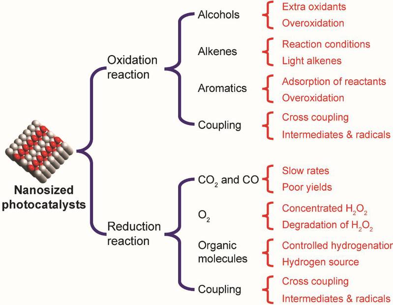 作者总结了近年来光催化合成各种重要化学品方面的研究进展,详细讨论了反应机理的基础认知和纳米结构光催化剂的设计进展,并针对异相光催化材料绿色合成的关键科学问题和未来研究方向进行了展望。作者按氧化反应和还原反应梳理了异相光催化合成化学及光催化剂的设计。其中氧化反应细分为醇氧化、环氧化、芳烃氧化和氧化偶联反应;还原反应细分为加氢反应和还原偶联反应。虽然许多具有挑战性的反应可以通过使用各种多相光催化剂材料来实现,但仍有一些关键的挑战需要解决,以此来满足工业应用的需求。从工业的角度来看,高选择性可以消除能耗分离过程。对于光催化氧化工艺,应避免使用强氧化剂,以防止过度氧化。对于光催化还原反应,应避免使用苛刻的反应条件和有毒化合物(即强碱或强酸条件、高温、强还原剂和有毒溶剂)。另外,适合光催化应用的流动相反应器的设计和开发对于光催化材料的评价和光催化过程的放大是迫切需要的。