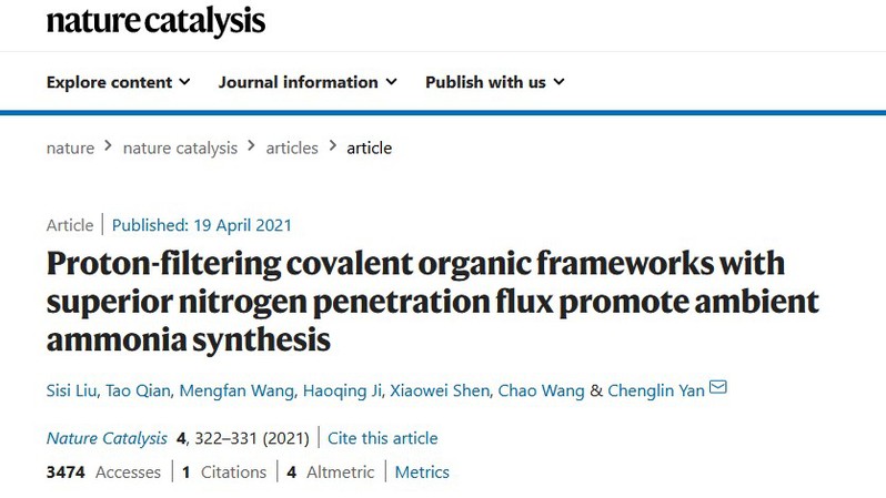 近日,国产成人 晏成林团队在绿色低碳合成氨领域取得新进展,实现在常温常压条件下合成氨的产率和法拉第效率的大幅度提升,研究成果以“Proton-filtering covalent organic frameworks with superior nitrogen penetration flux promote ambient ammonia synthesis”为题发表于《自然催化》(Nature Catalysis)期刊上。